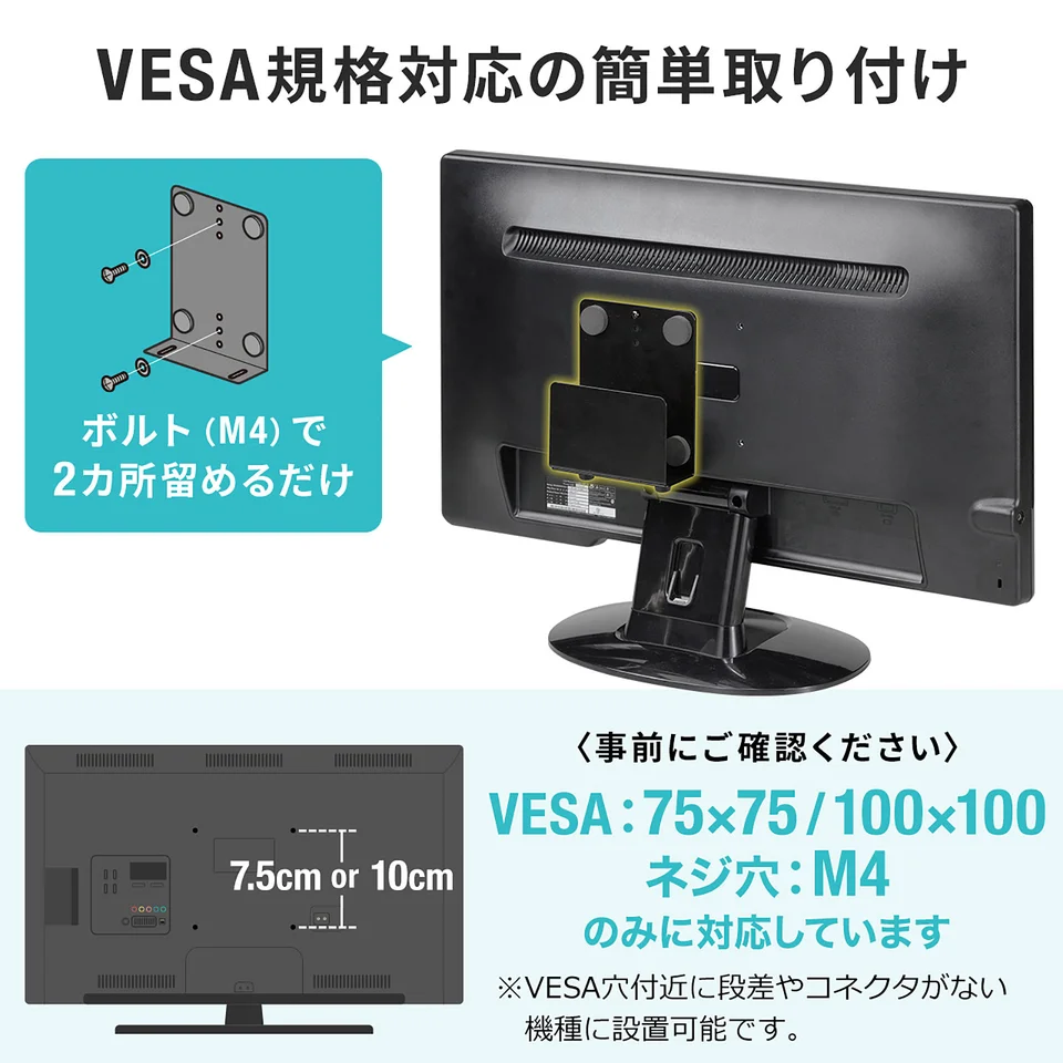 モニターへの取り付けに関しては、VESA規格のねじ穴を用いて固定します。最近のモニターでVESA規格のねじ穴がついていないことはほぼありません。