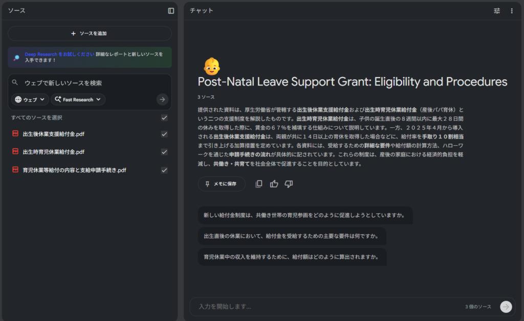 そこで今回は、NotebookLMを「育児の副操縦士」にするための最初の実践として、これら複雑な制度資料のインプットと構造化に挑戦しました。