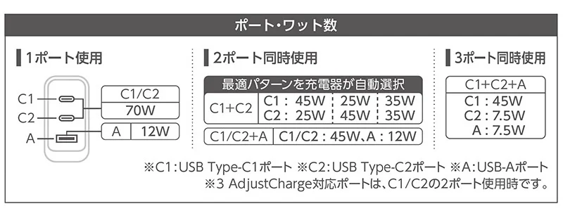 搭載された独自技術『AdjustCharge』は、充電器内部のマイクロコントローラーが接続されたデバイスを瞬時に見極め、最適な電力を自動で振り分けます。