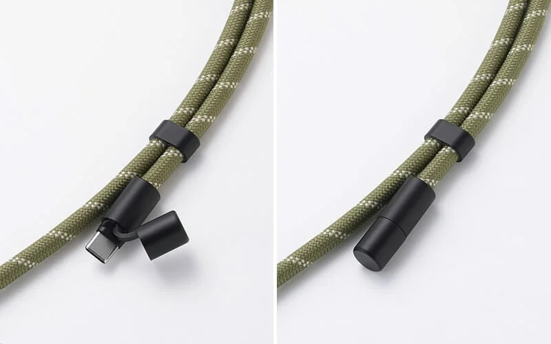 「まるで登山ロープのようなガチな質感。これがケーブルだとは誰も気づきません!」 。 「アースカラーが絶妙で、オフィスカジュアルにも合わせやすいです」 。 「出先で充電が切れそうな時、バッグを漁らずに済んだのは本当に感動した…」。