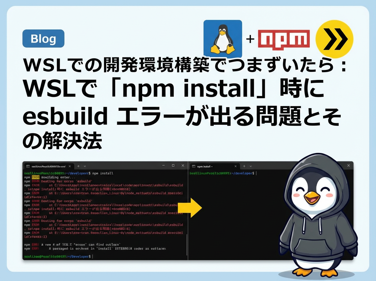 これは、esbuild のインストールスクリプトが Windows の Node.js を誤って呼び出してしまい、WSL 上で正しく動作しないことが原因です。